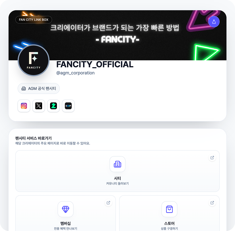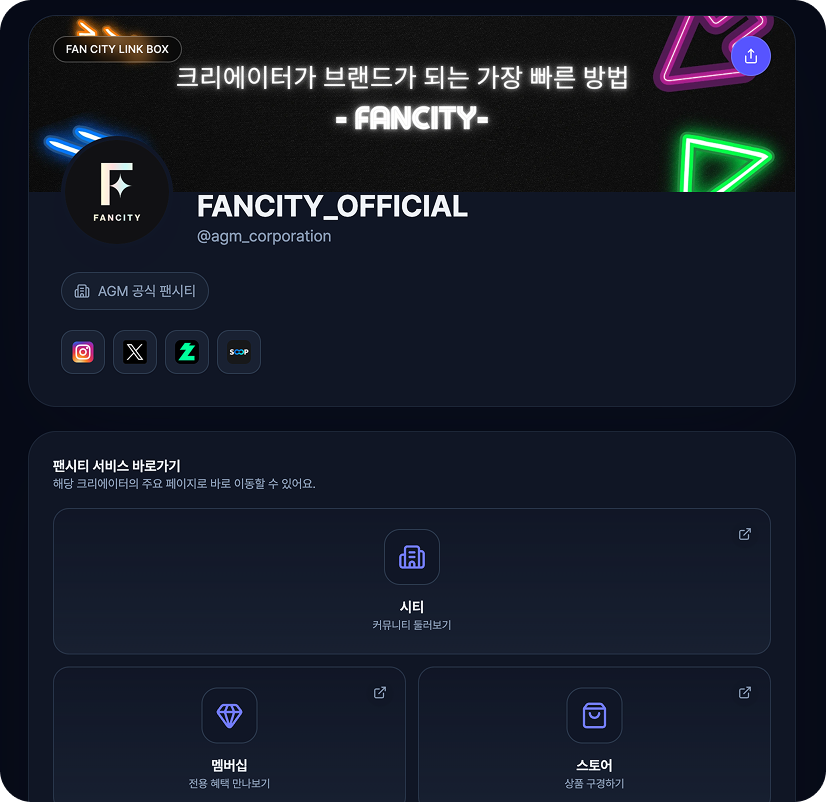 팬이 어디서 유입되든 한 번의 클릭으로 크리에이터 소개, 외부 채널, 팬시티 수익 기능까지 자연스럽게 이어집니다.